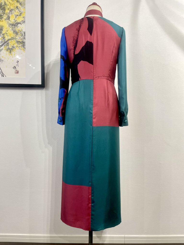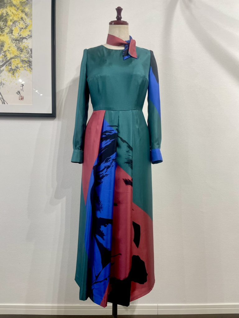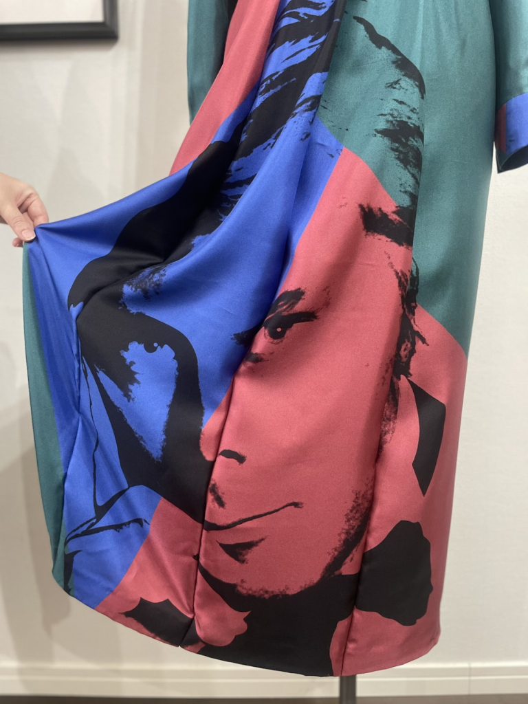 旅行中に立ち寄ったお店で見つけた美しいサテン生地には、大胆なアルマーニのお顔のプリントが!何を仕立てるか話し合った結果、ワンピースにして柄をそのまま生かすことに。
