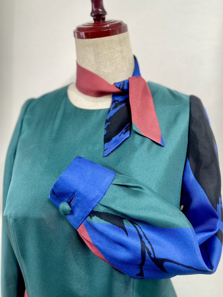 スカーフもセットでお仕立てしました。カフスのコロンとしたボタンも個性的です。