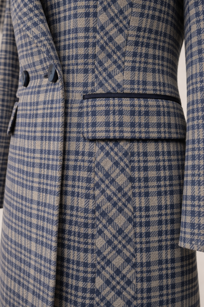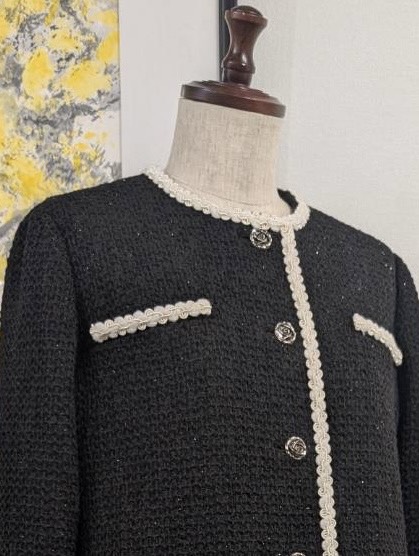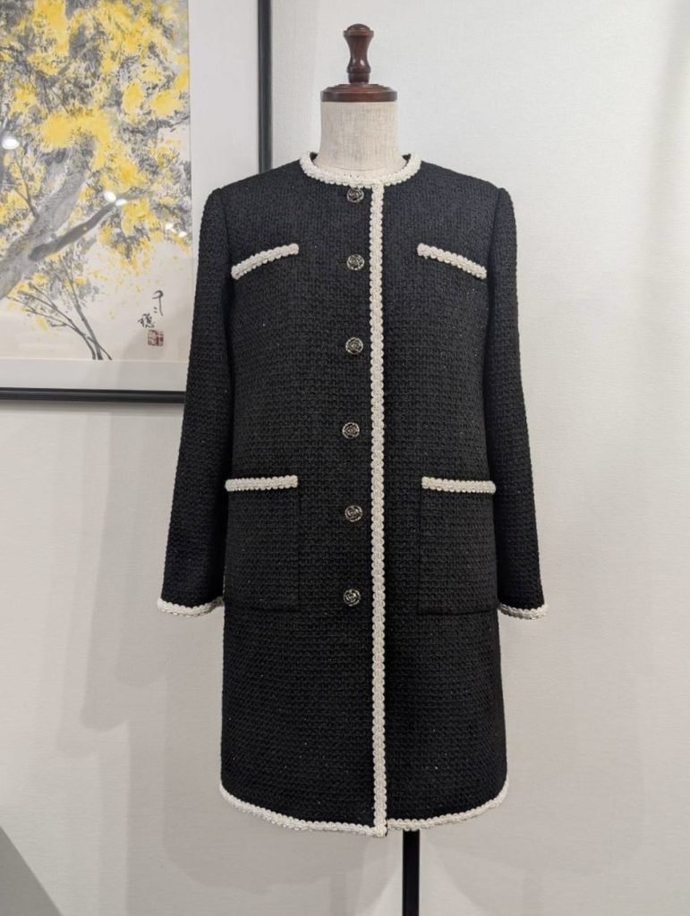 今回はその質感を存分に活かし、クラシカルな シャネル風のロングコートと、スカートのセットアップをお仕立て。白のブレードで縁取った立体的なラインが、お顔周りをパッと華やかに引き立てます。